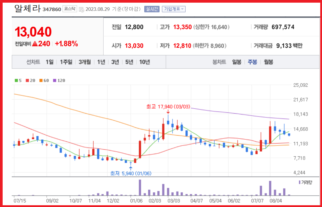 솔직히 알체라 같은 경우는 의료 AI 관련주라고 하기에는 테마 연관성이 조금 약합니다. 그래도 한번씩 엮여서 올라가줄때는 힘이 상당히 좋기 때문에 5위에 넣었습니다.