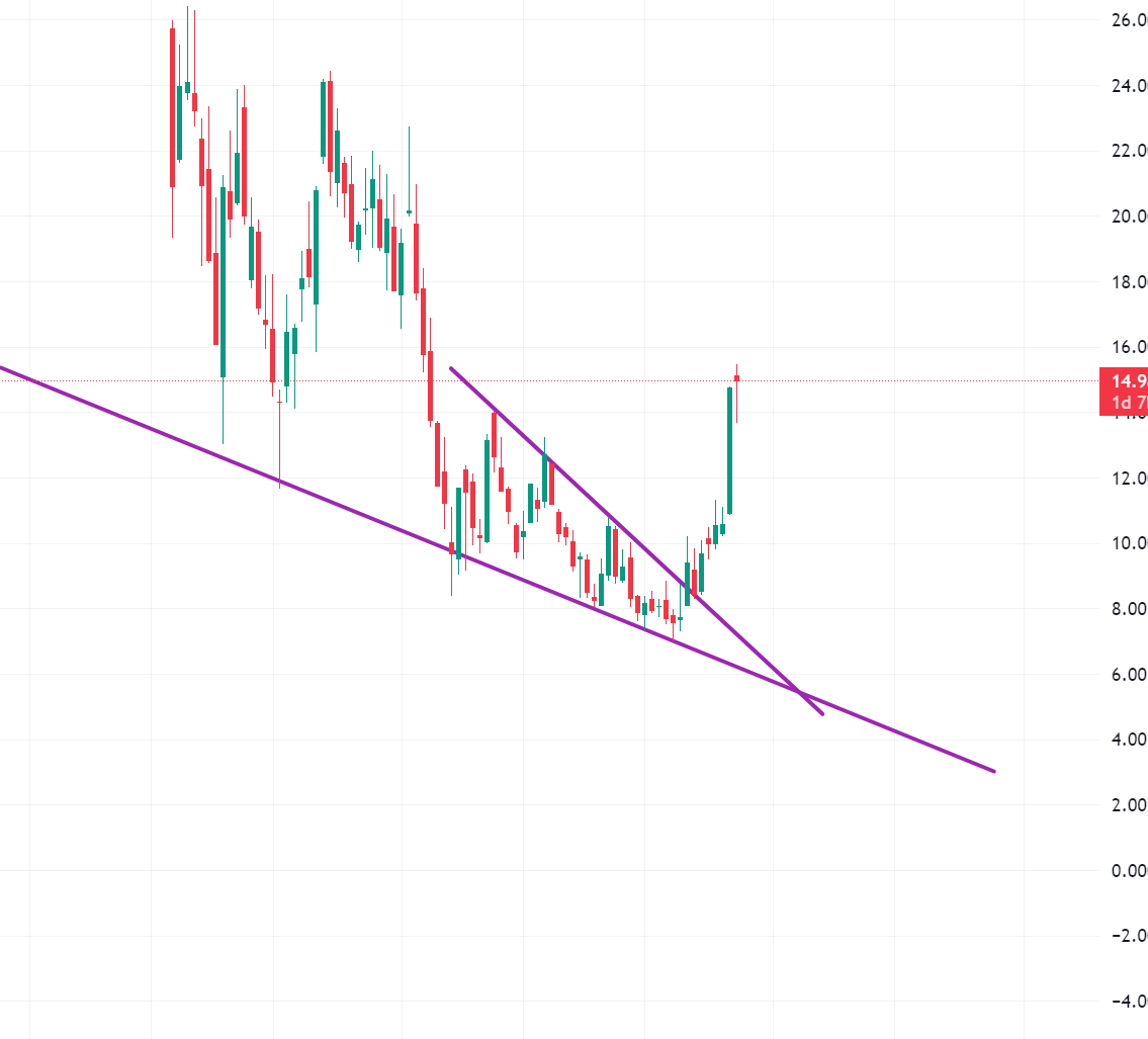 현재 큰 불반등 이후 이전 지지대였던 15달러 부근에서 비벼지고 있는 상황입니다. 여기가 주요한 저항대가 된 이유는 이전 차트를 보시면 알겠지만 2022년 하락때 지지를 몇번 받았던 구간이기 때문이죠.