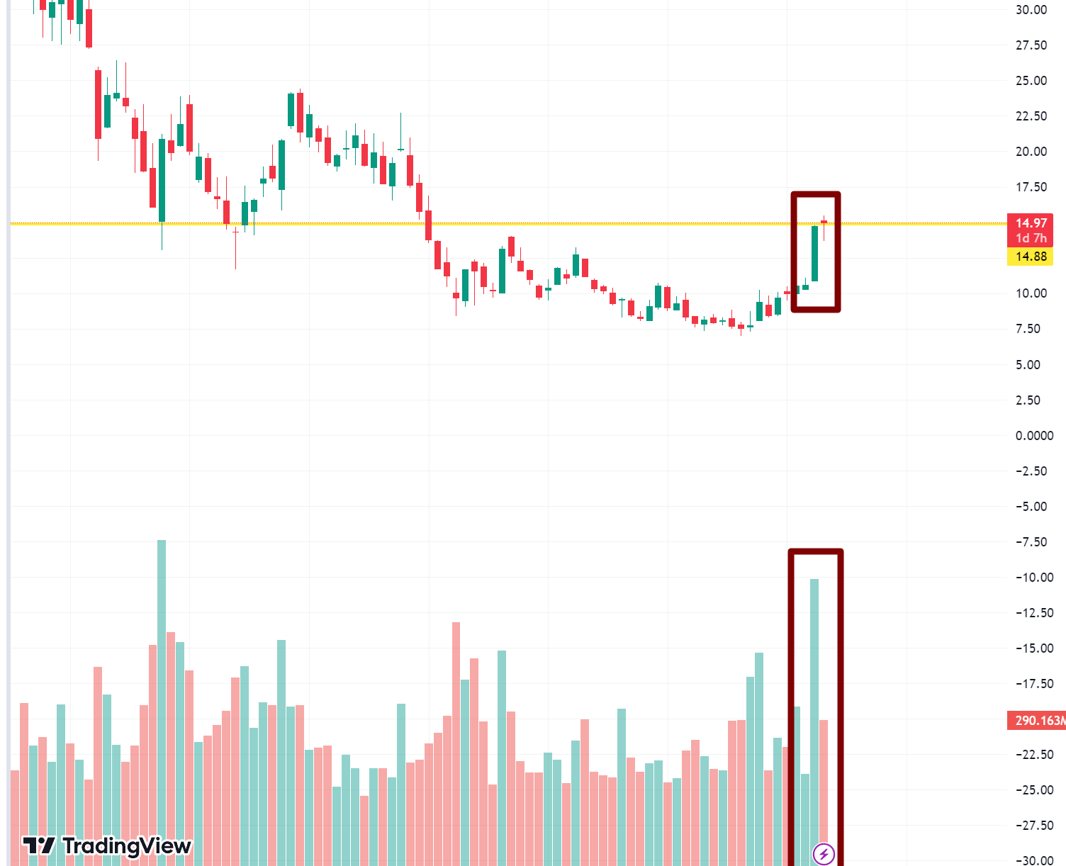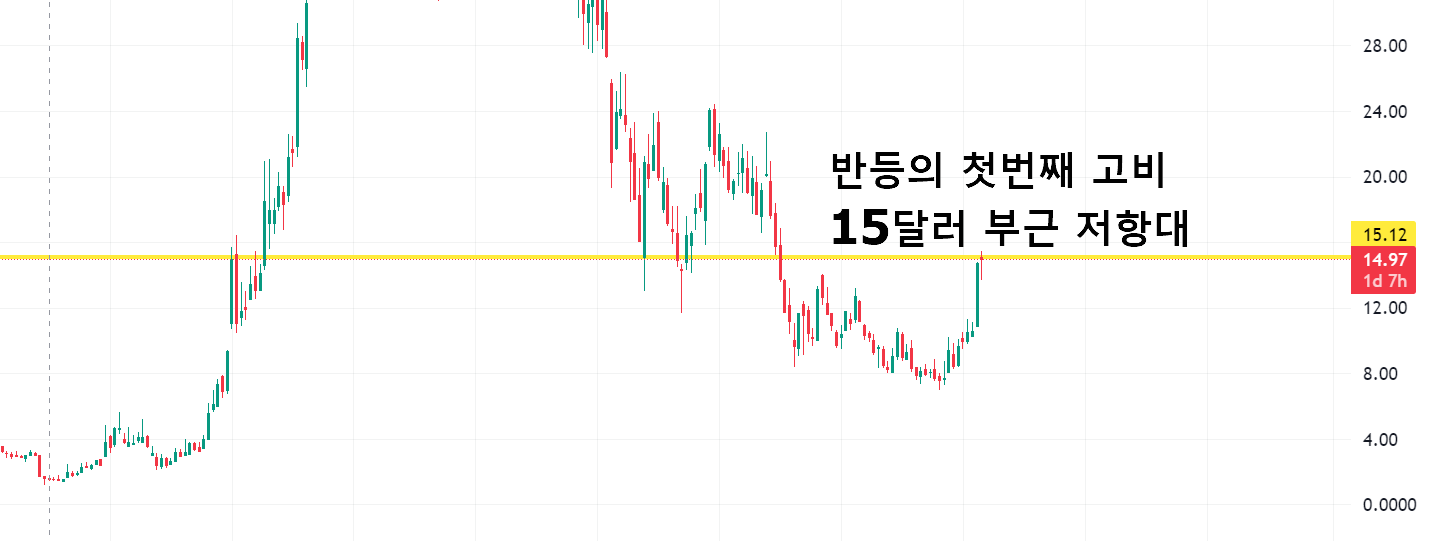 현재 큰 불반등 이후 이전 지지대였던 15달러 부근에서 비벼지고 있는 상황입니다. 여기가 주요한 저항대가 된 이유는 이전 차트를 보시면 알겠지만 2022년 하락때 지지를 몇번 받았던 구간이기 때문이죠.