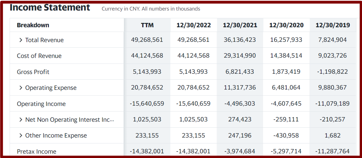 니오의 재무제표 입니다. 일단 2019 년에 비해서 총매출이 거의 7배 가까이 상승한걸 볼 수 있습니다. 폭발적인 전기차 수요 증가와 함께 우상향을 그리고 있는 매출성장률입니다. 개인적으로는 모든 주식을 평가할때 매출성장률을 꼭 보시는걸 추천드립니다.