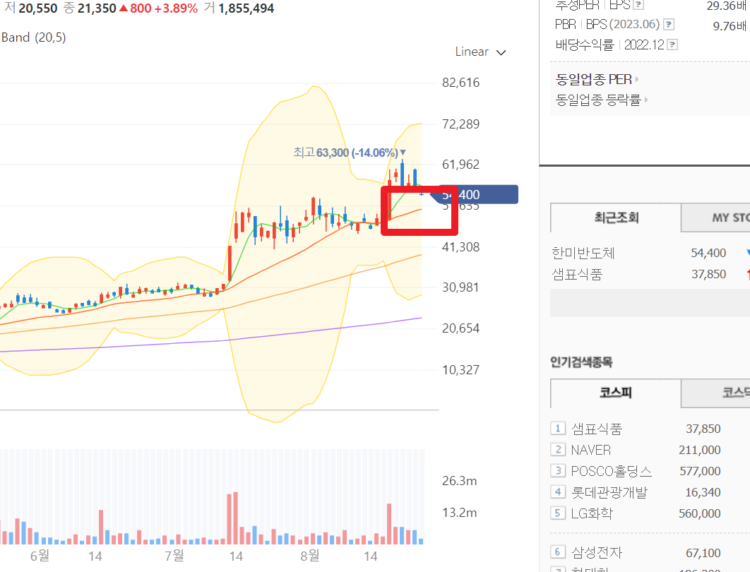 보통 이런 구간에서 매수하는게 맞긴 한데 참 어렵습니다. 아 참고로 해당 밴드 차트 보는 법은 네이버에 다 나와 있기 때문에 꼭 유용하게 쓰시면 좋습니다.